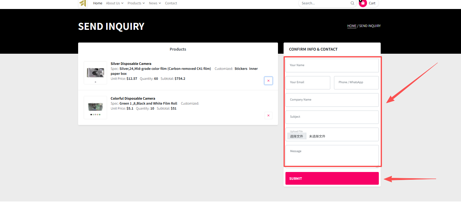 Review the cart contents to ensure all items are correct. Fill in your personal information on the right side to facilitate our contact with you. Finally, click “Submit” to send your inquiry.