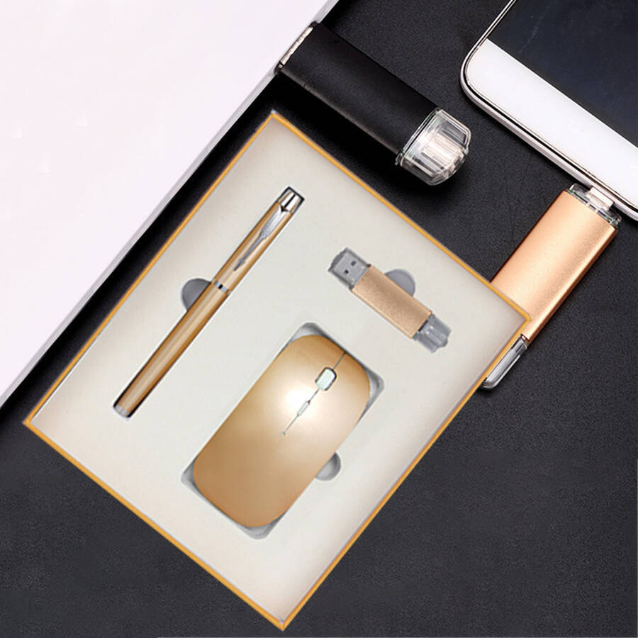 Designed for efficient work and meaningful connections. This gift set features three essential tools for daily productivity: a responsive wireless mouse, a high-capacity flash drive with rapid data transfer, and a smooth-writing signature pen.