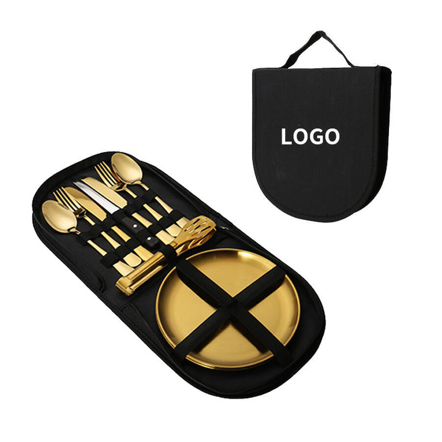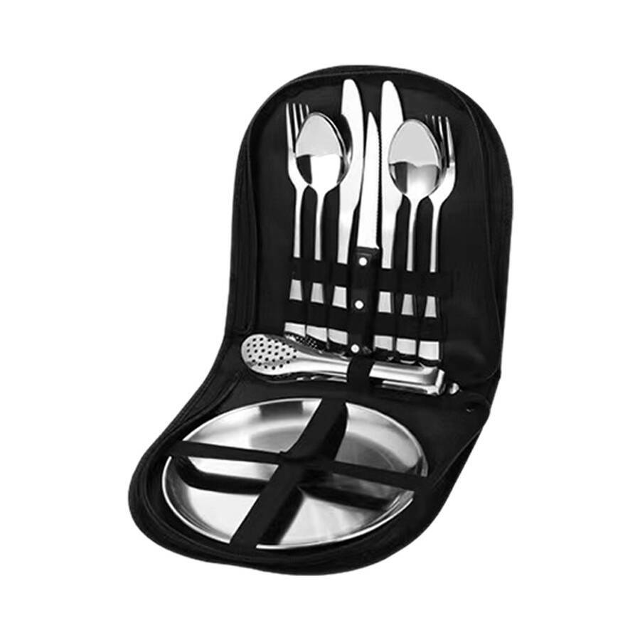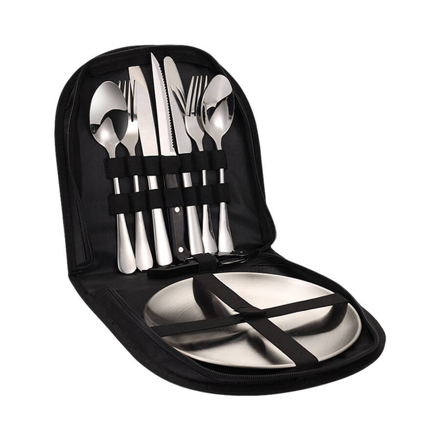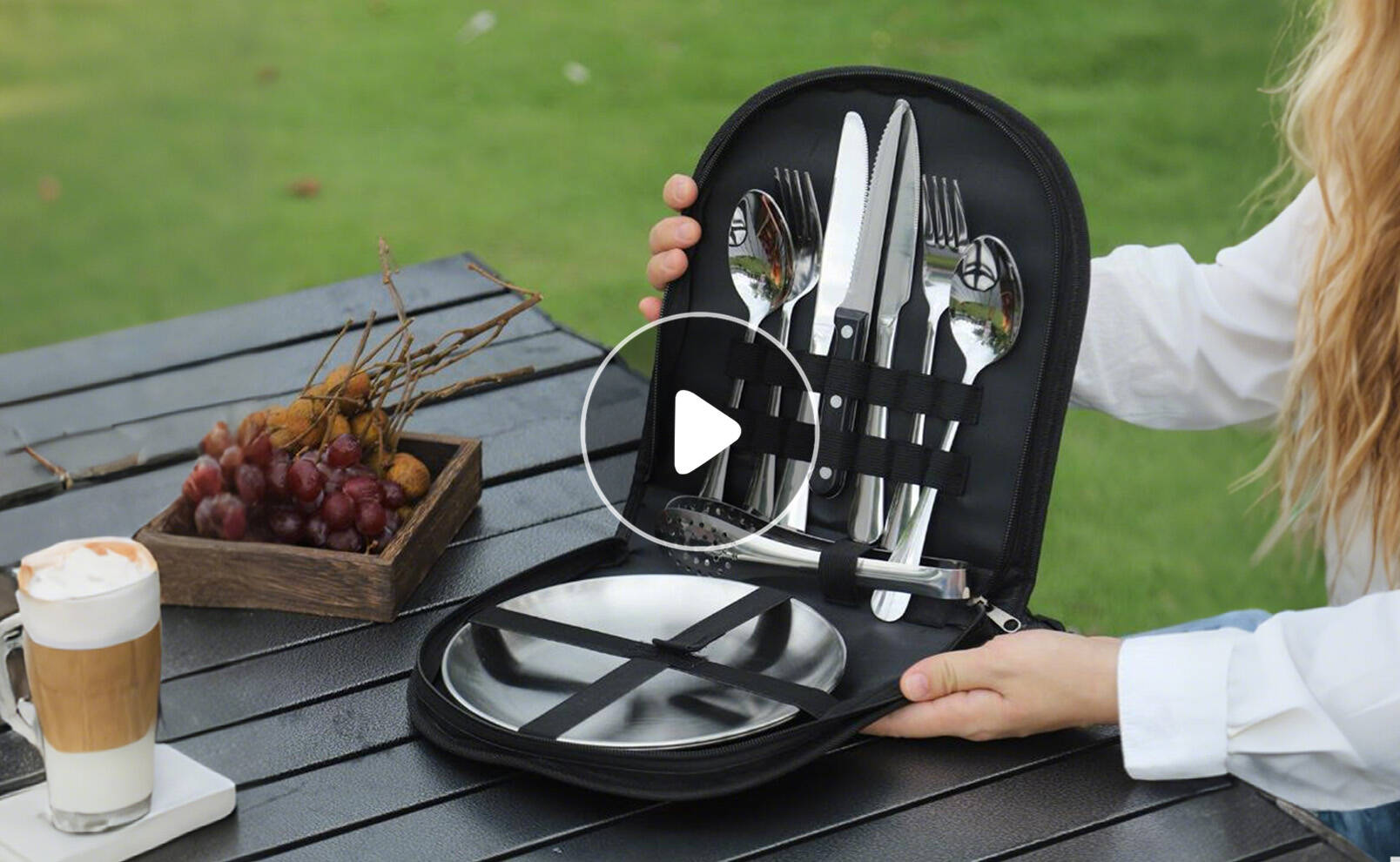 Professional outdoor BBQ tool set featuring stainless steel utensils and compact carrying case. Designed for camping, picnics, and backyard grilling with complete cooking accessories.