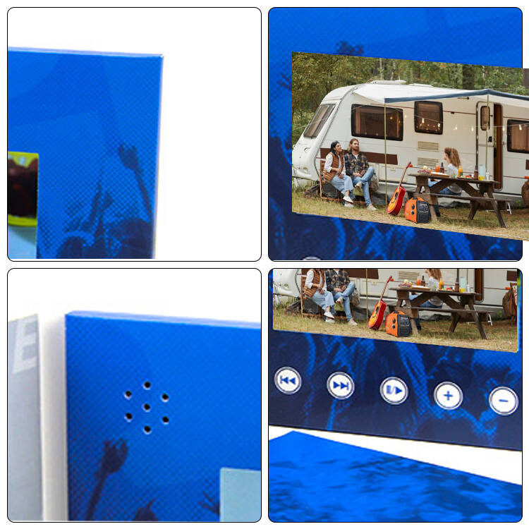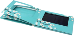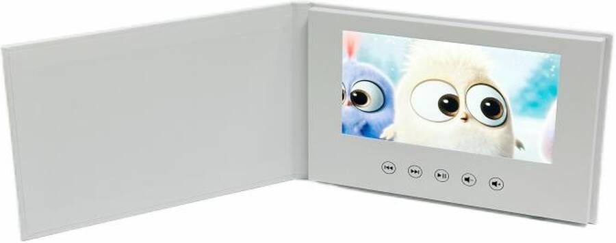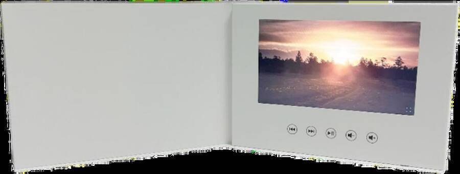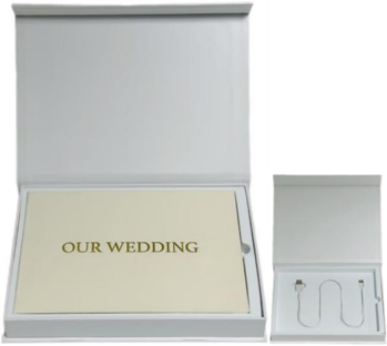 A digital photo album with a built-in screen, designed as an elegant hardcover book. Perfect for playing wedding videos, photo slideshows, and music. Ideal as a wedding keepsake or corporate gift.