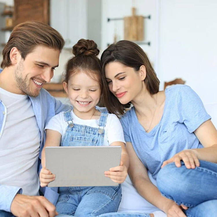 A digital photo album with a built-in screen, designed as an elegant hardcover book.
