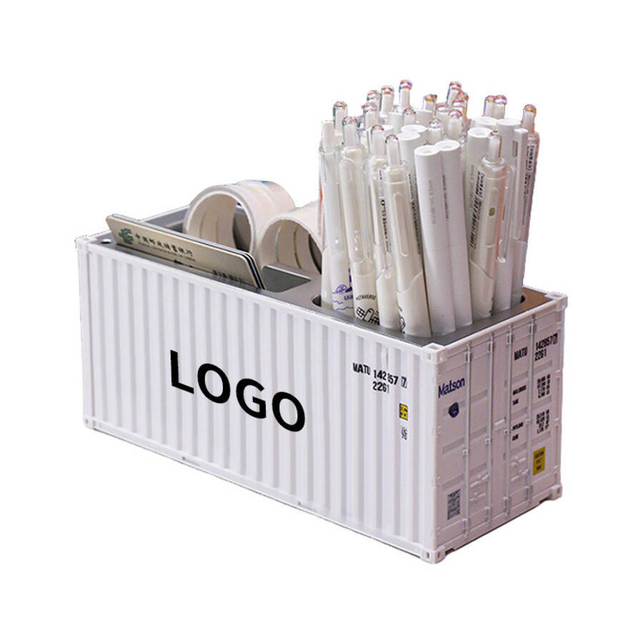 This is a creatively designed desktop pen holder shaped like a shipping container. Made from durable