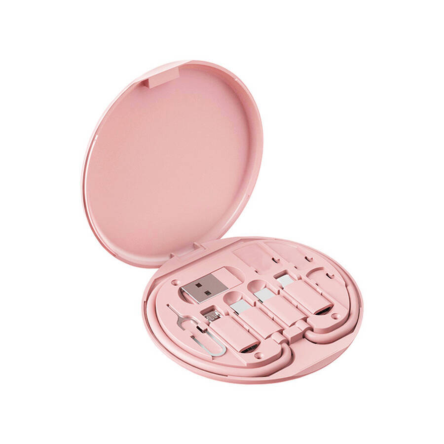 A compact, round case containing five essential charging cables (including USB-C) for multiple devic