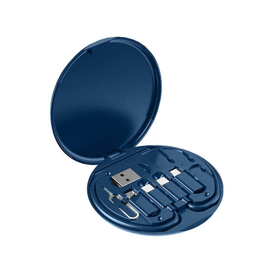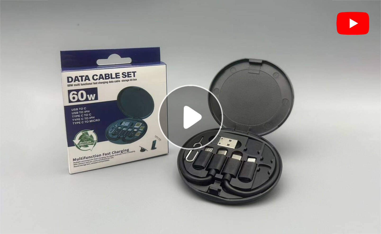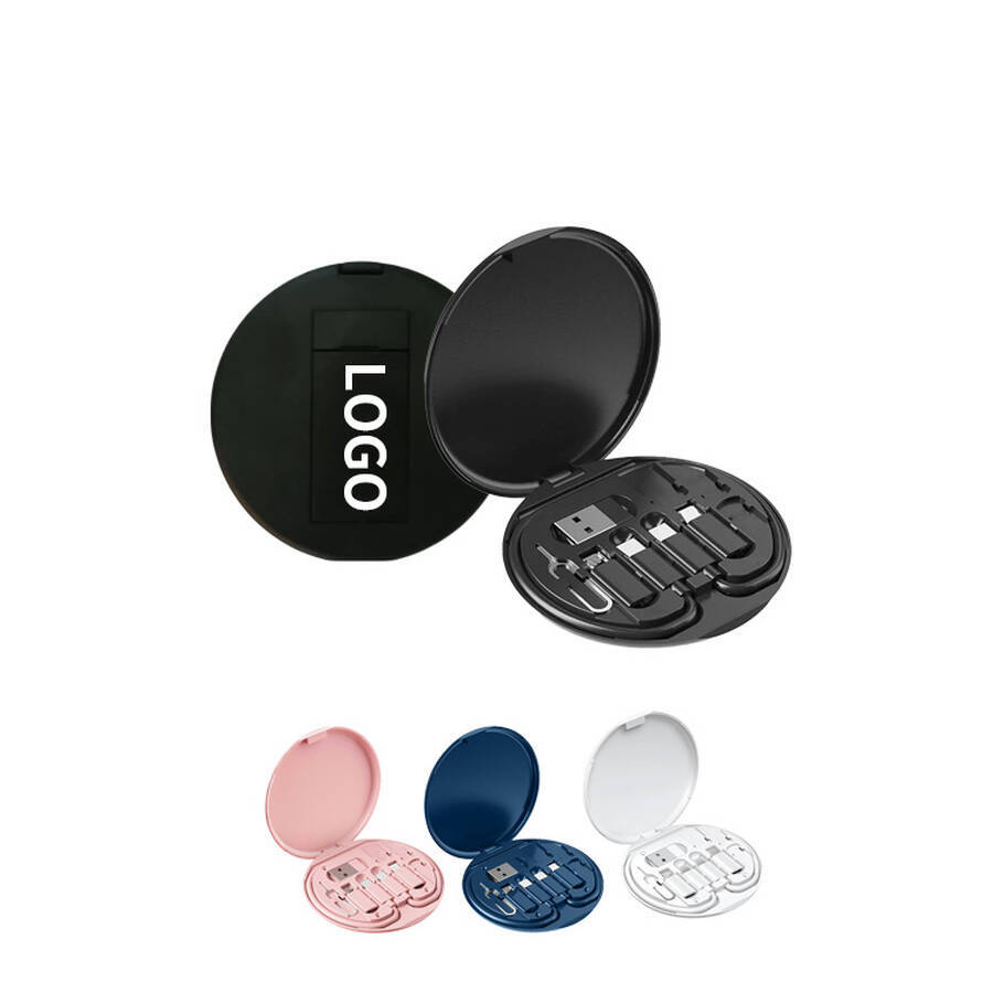 A compact, round case containing five essential charging cables (including USB-C) for multiple devices. It supports 60W fast charging, keeps cables tidy, and is ideal for travel or as a customizable gift.