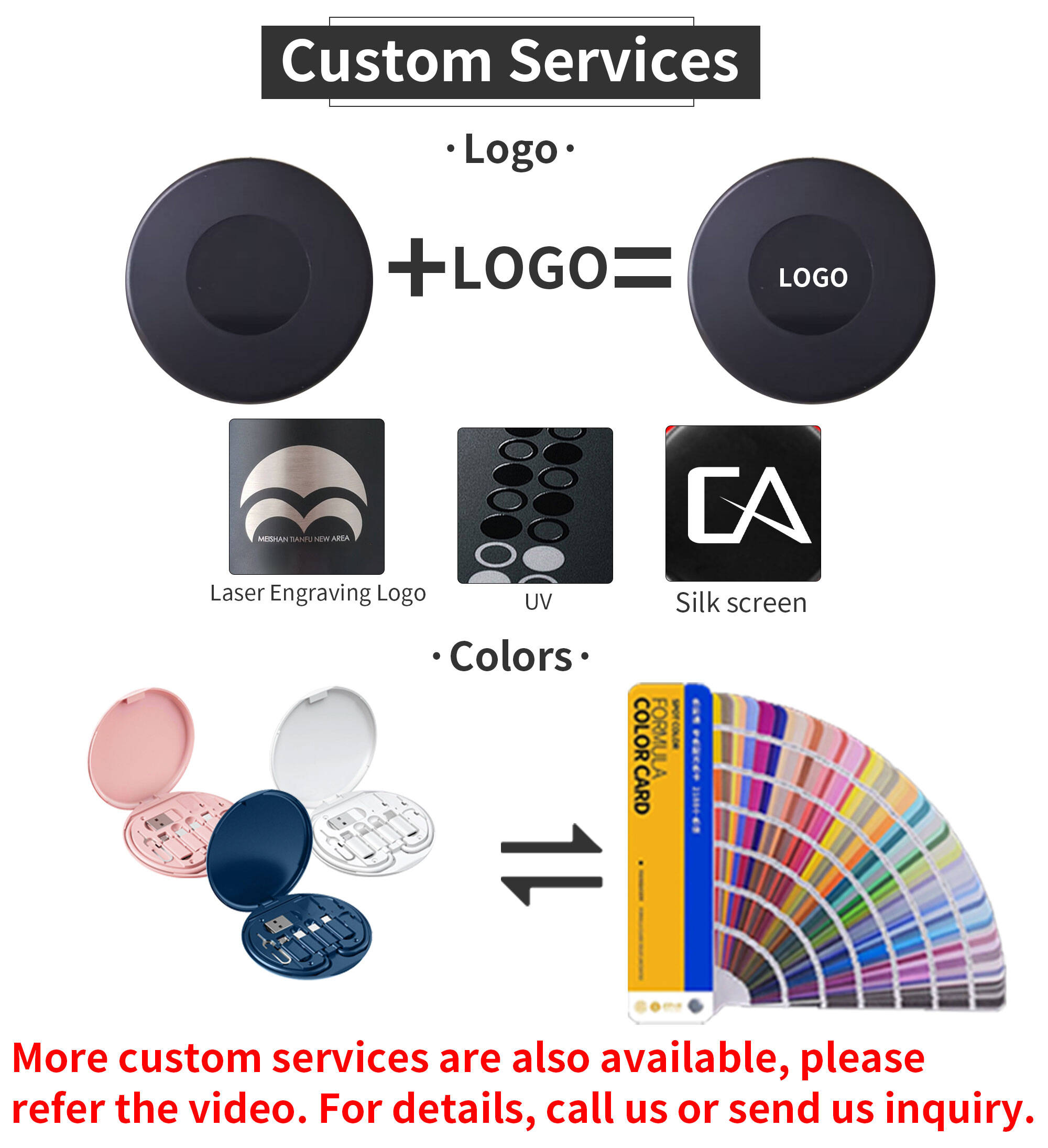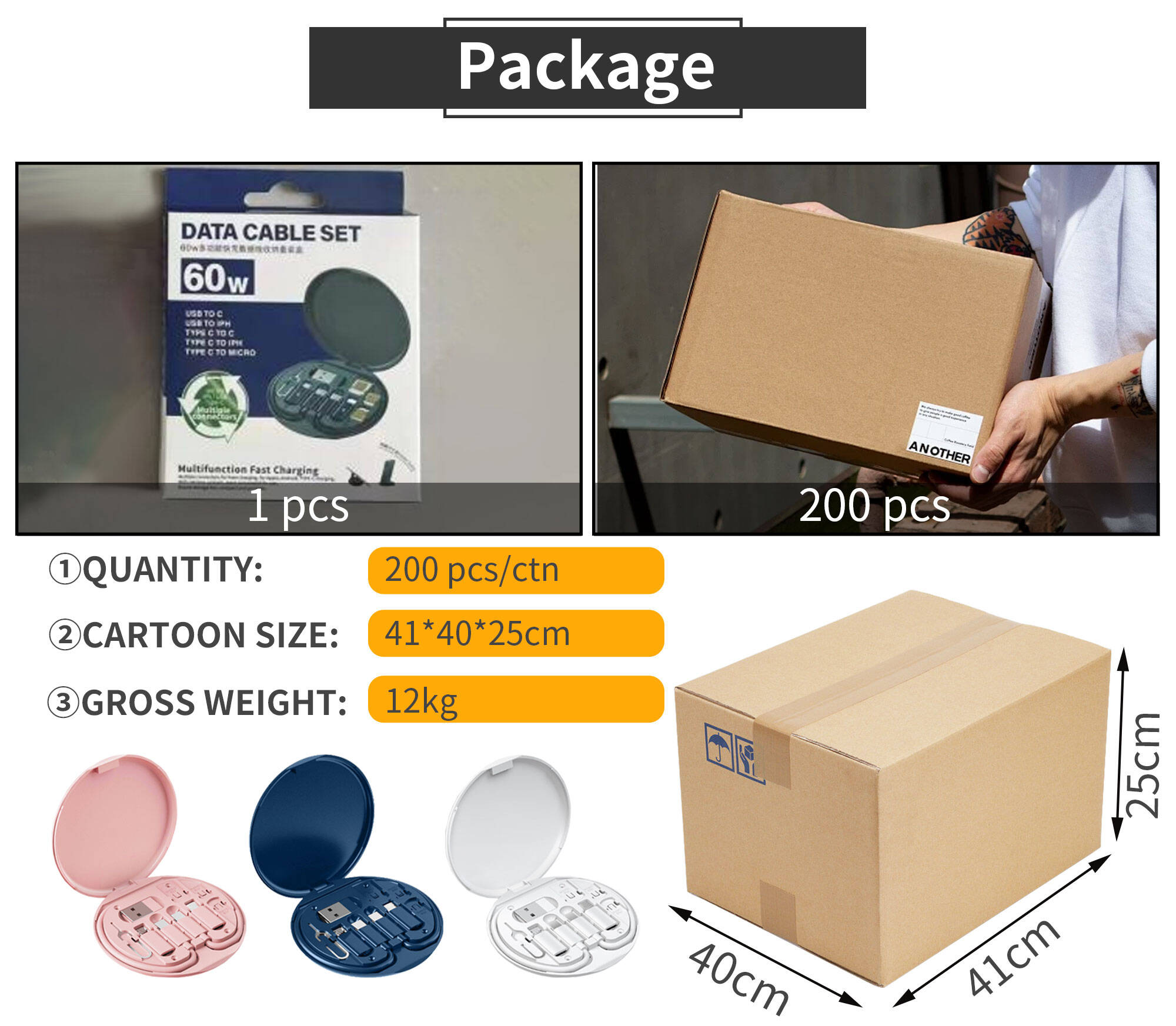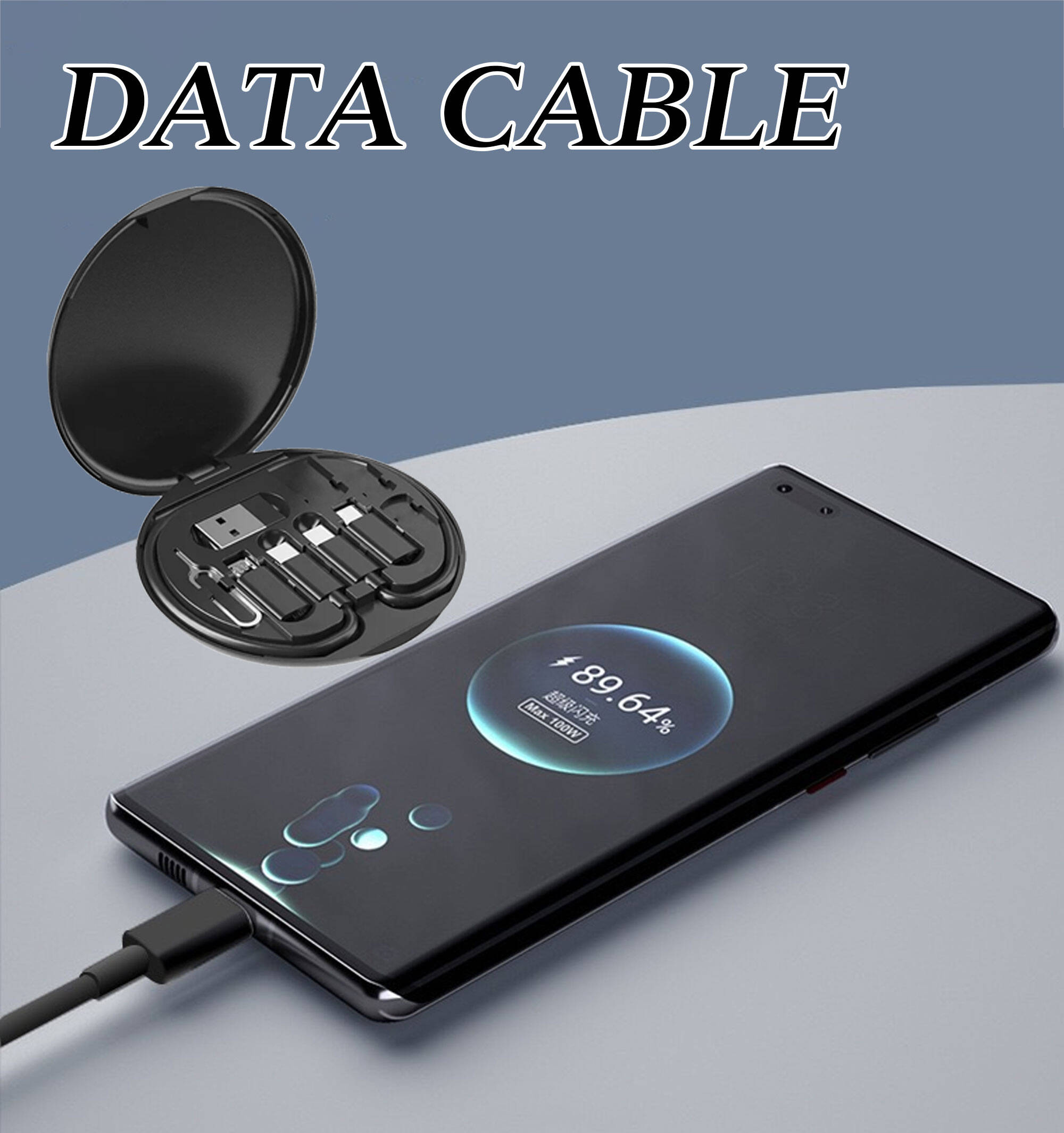 A compact, round case containing five essential charging cables (including USB-C) for multiple devices. It supports 60W fast charging, keeps cables tidy, and is ideal for travel or as a customizable gift.