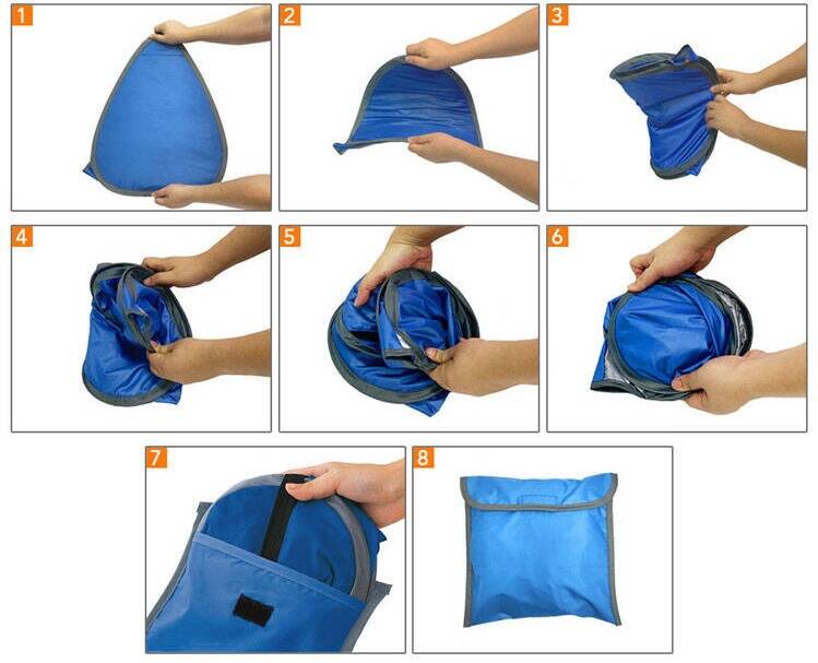 Process: Press both hinges simultaneously, fold the tent in half along the seam, then fold again into a flat “sandwich.” Finally, roll it up and place it in the storage bag.