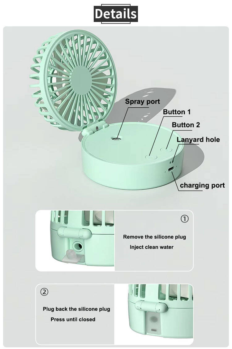 The Mini Mist Fan is a portable, foldable personal fan that combines cooling airflow with a fine mis