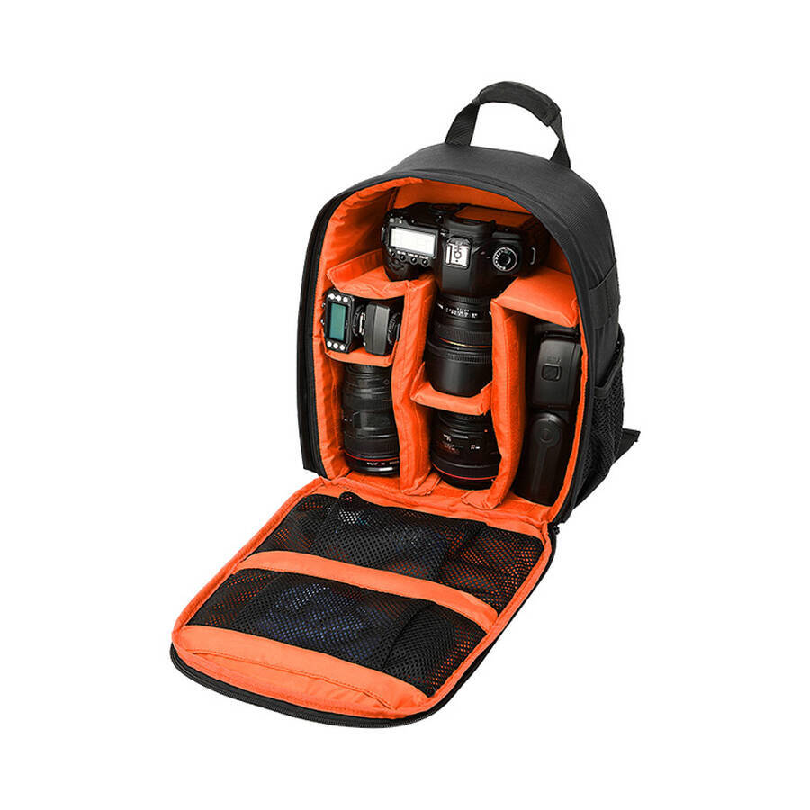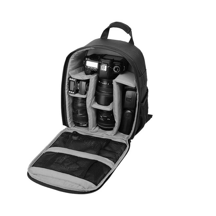 A: It is designed for DSLR and mirrorless camera systems. The padded interior can accommodate a camera body plus several lenses, a flash, and small accessories like batteries and memory cards.