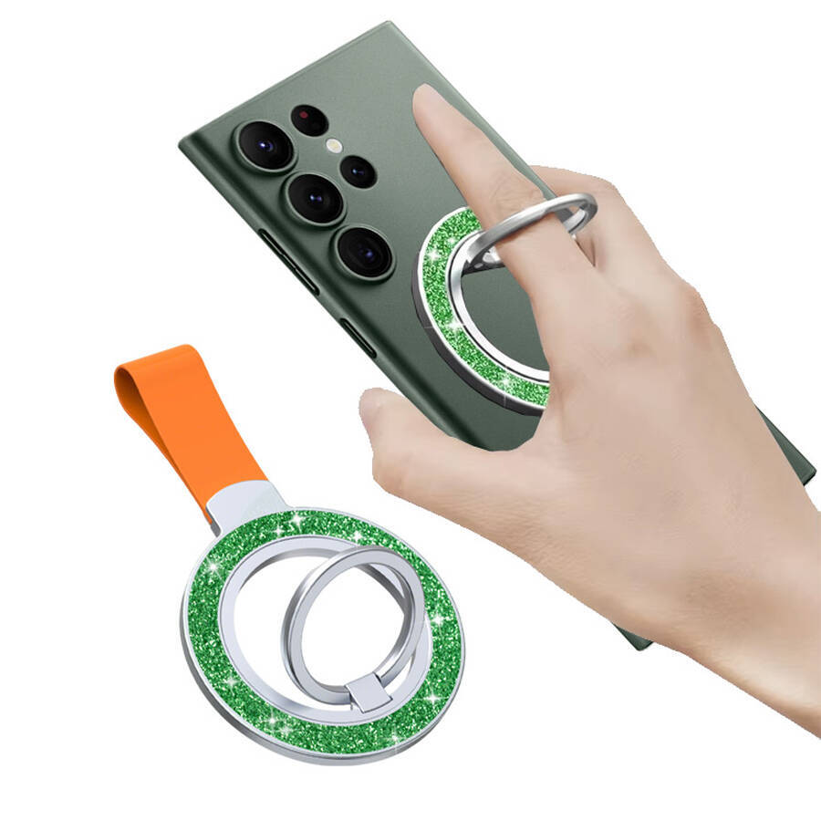 A: Yes, it comes with a strong adhesive pad that attaches securely to most smooth surfaces, including phone cases (plastic, silicone, etc.). Ensure the surface is clean before applying.
