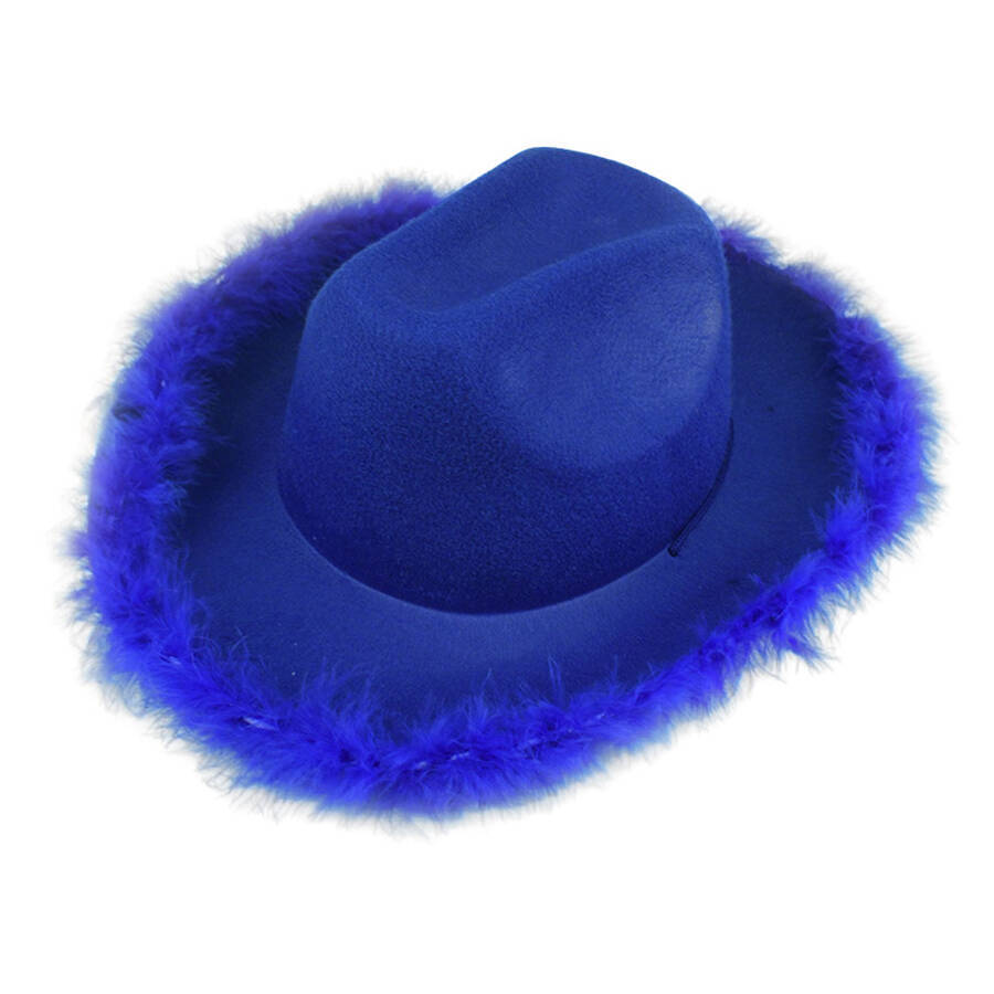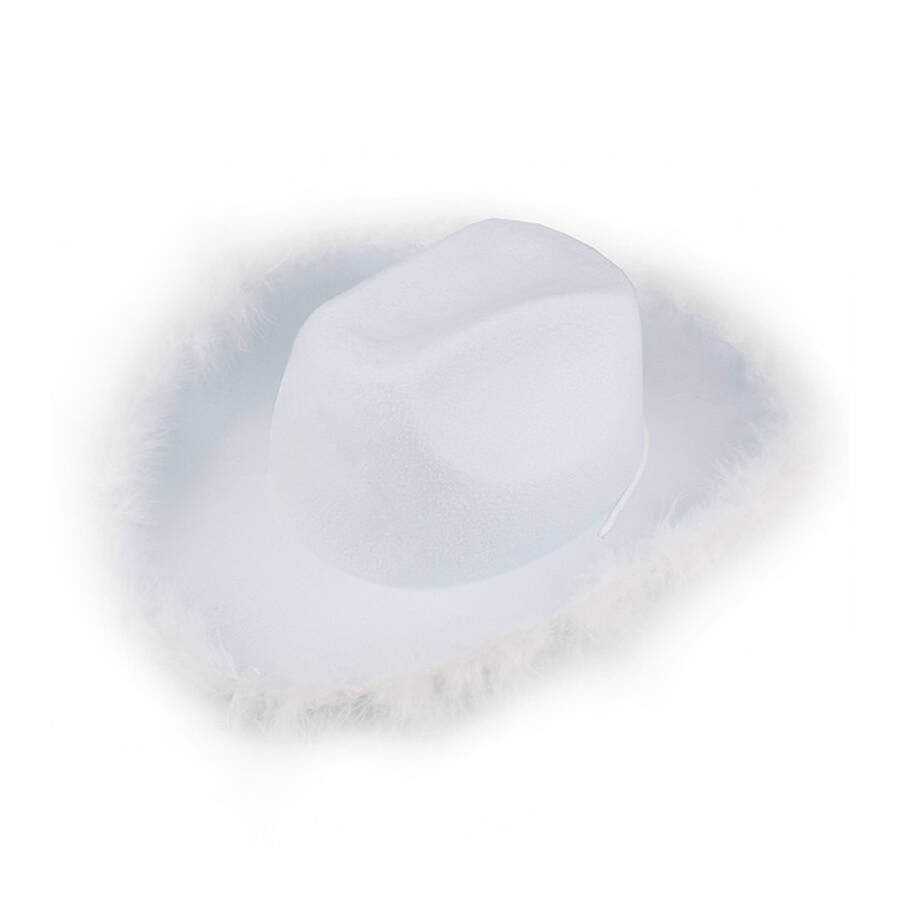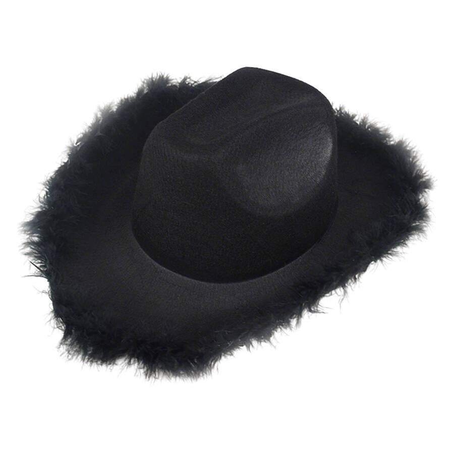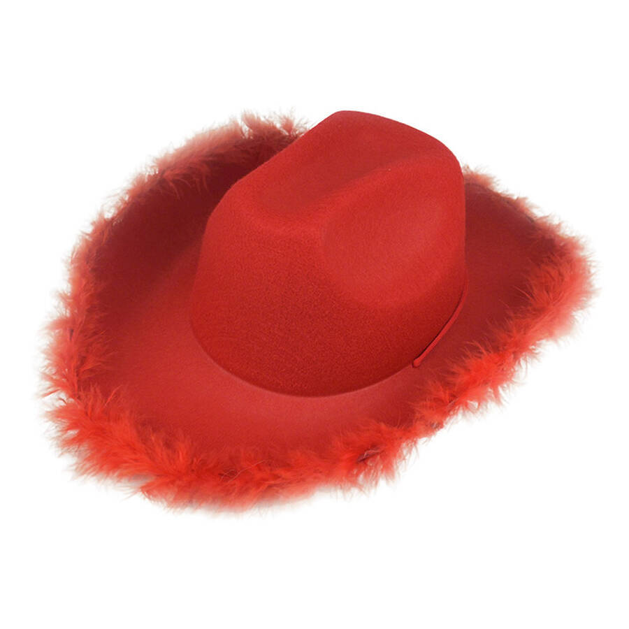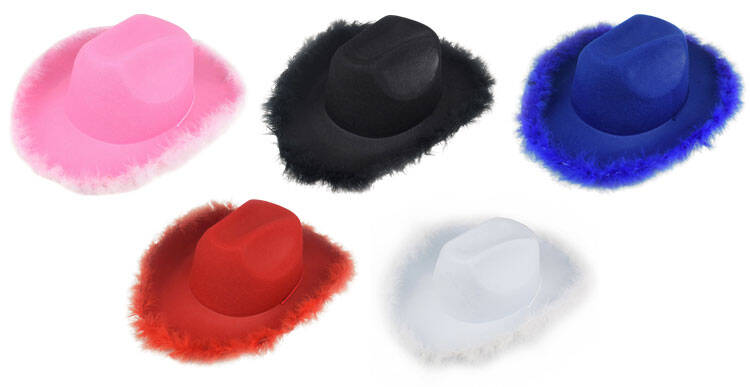 A1: A non‑woven feather‑trimmed cowboy hat features a non‑woven fabric crown. It also includes a hand‑decorated feather brim.