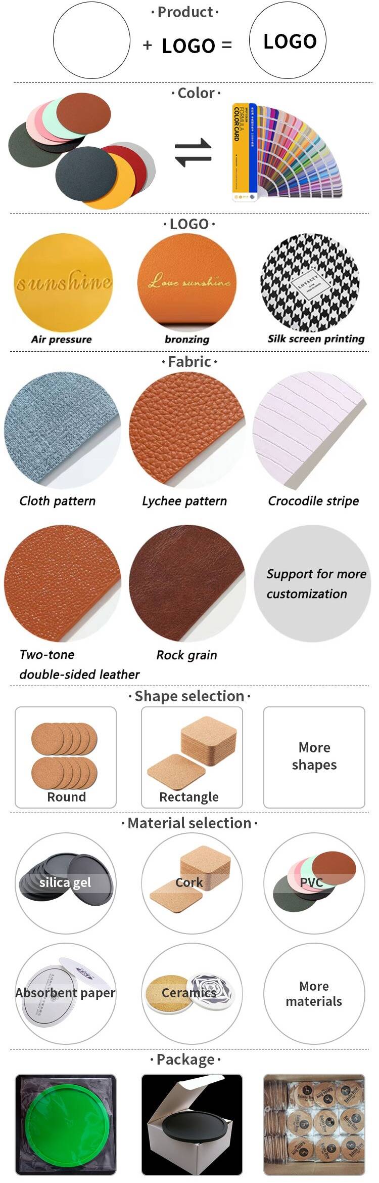 Comparison: Cork coasters are difficult to clean. Genuine leather coasters are susceptible to water and oil. PVC coasters wipe clean in an instant.