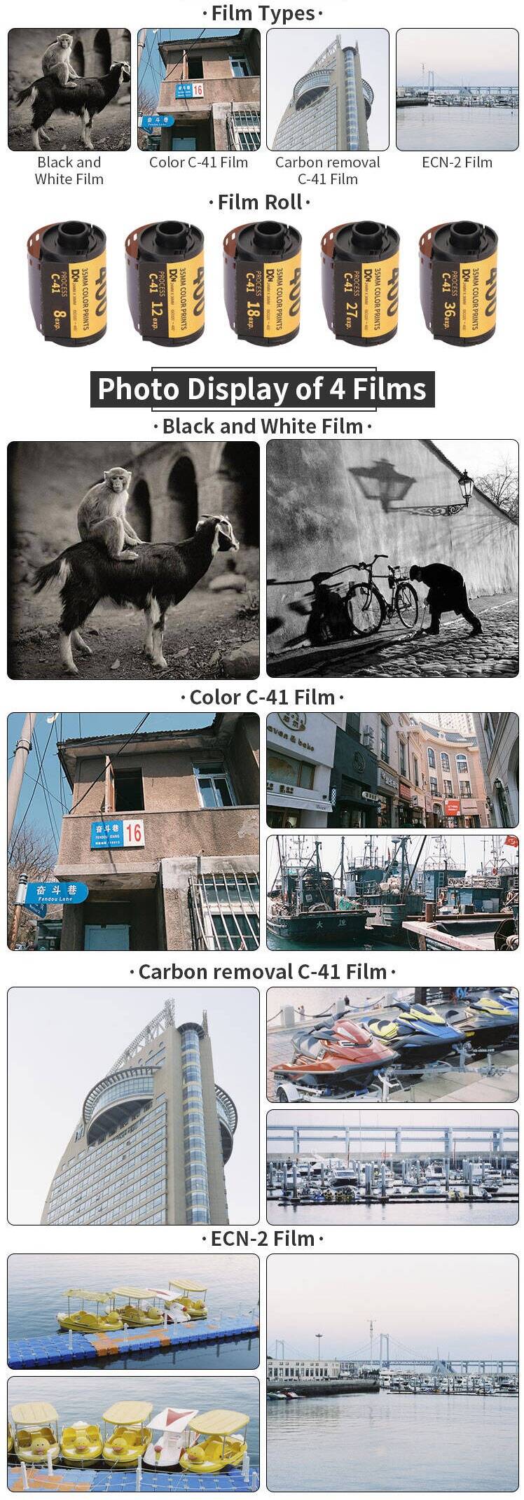 The art of imagery originates from film. We have carefully selected professional-grade films for this camera. Below you'll find their key specifications and visual characteristics. From richly saturated classic negatives with distinctive grain, to cool-toned cinematic rolls offering bold contrast—each variety empowers you to transform fleeting instants into unique artistic creations.