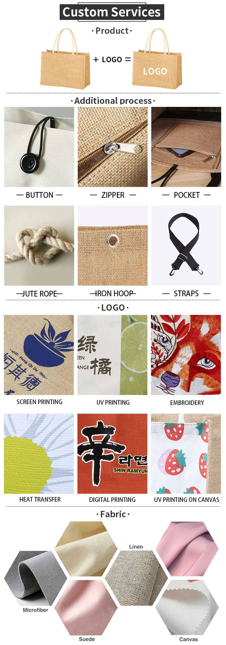 Embrace eco‑friendly style with our Jute Tote Bag, crafted from natural burlap (jute) and durable canvas. Available in multiple sizes and style combinations – including spliced (jute+canvas) or all‑jute, with either canvas or jute handles – this versatile tote bag is perfect for shopping, beach trips, gift packaging, or everyday carry.