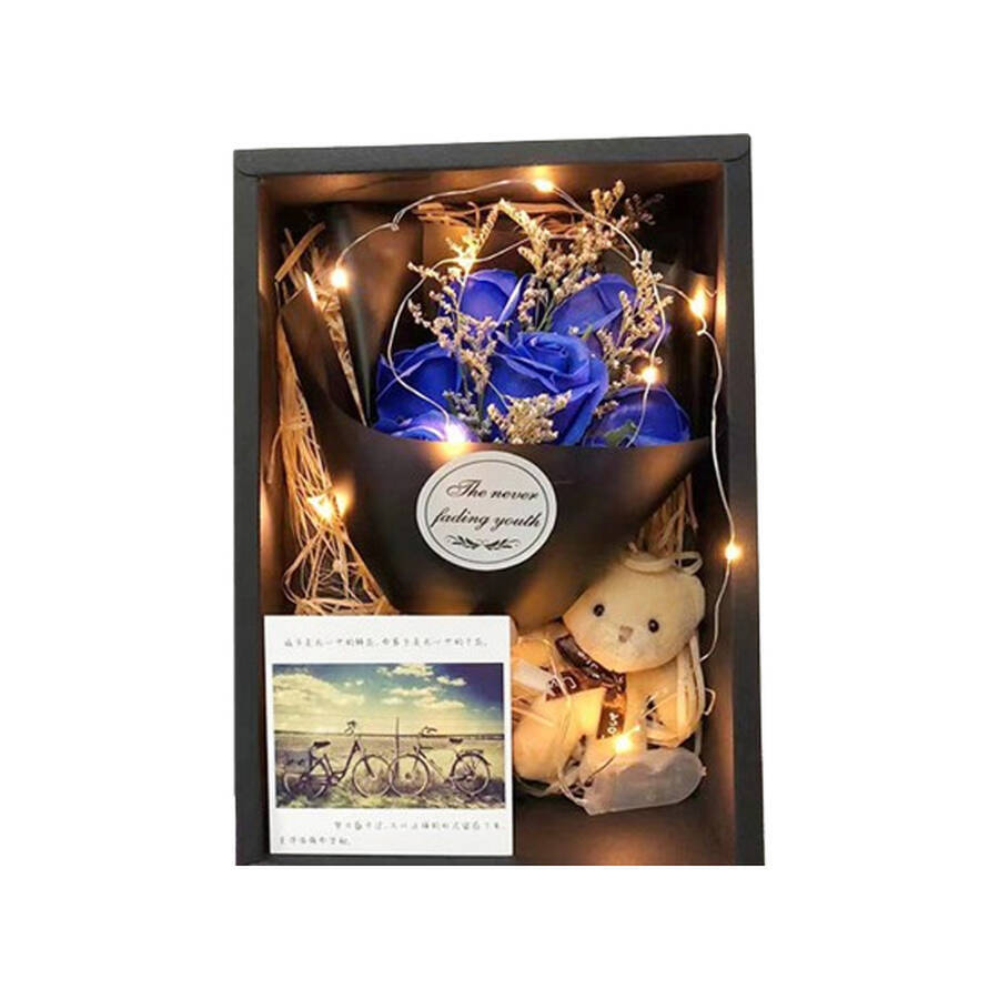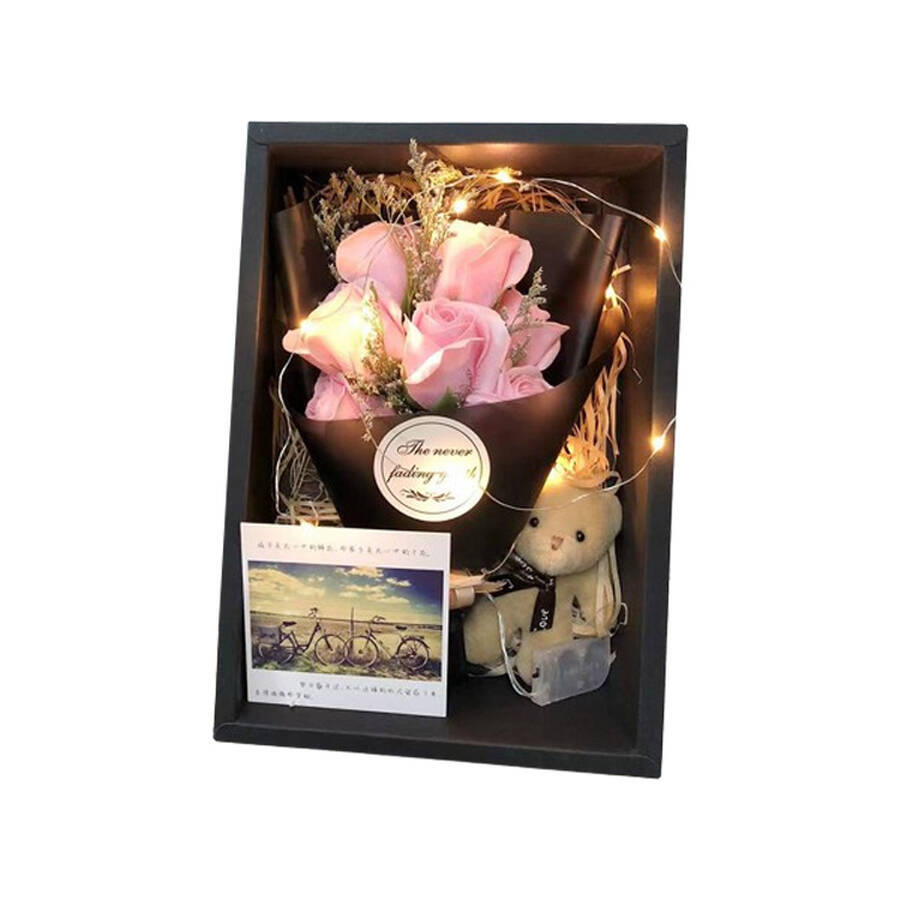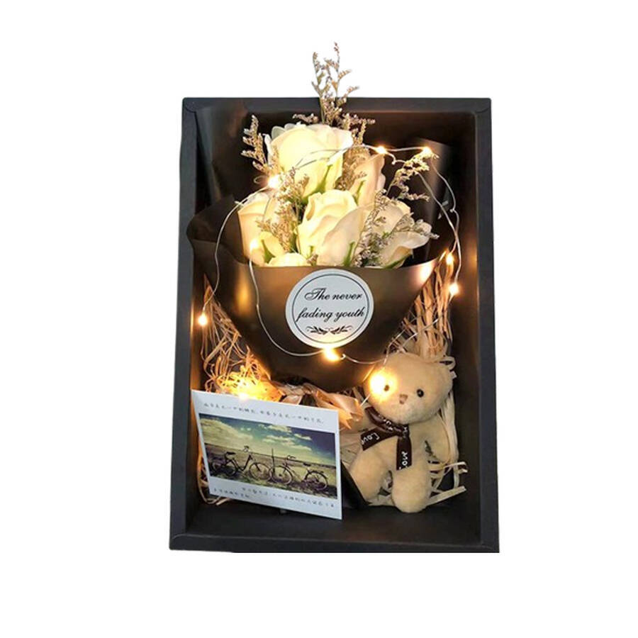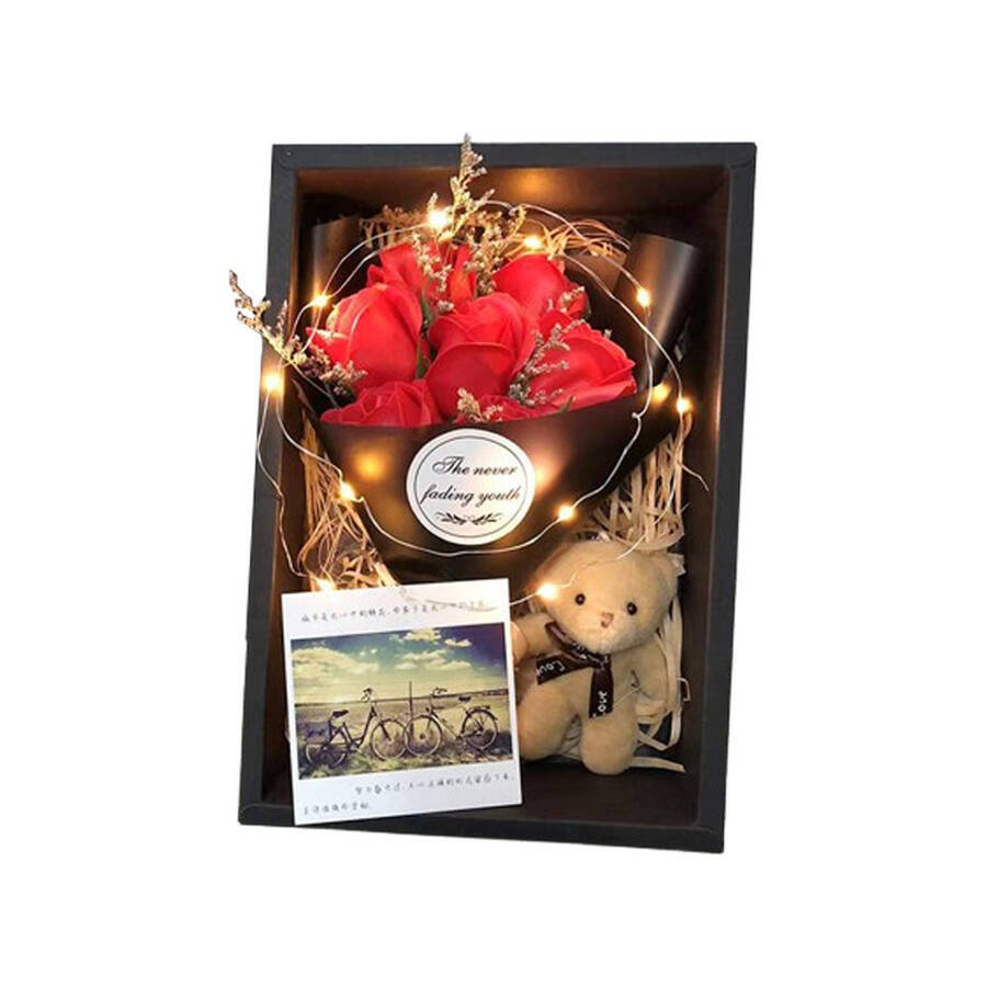 A luxurious rose bear gift set featuring a lifelike teddy bear and preserved roses. Combining timeless beauty with romantic symbolism, it serves as an elegant gift or decorative piece for special occasions.