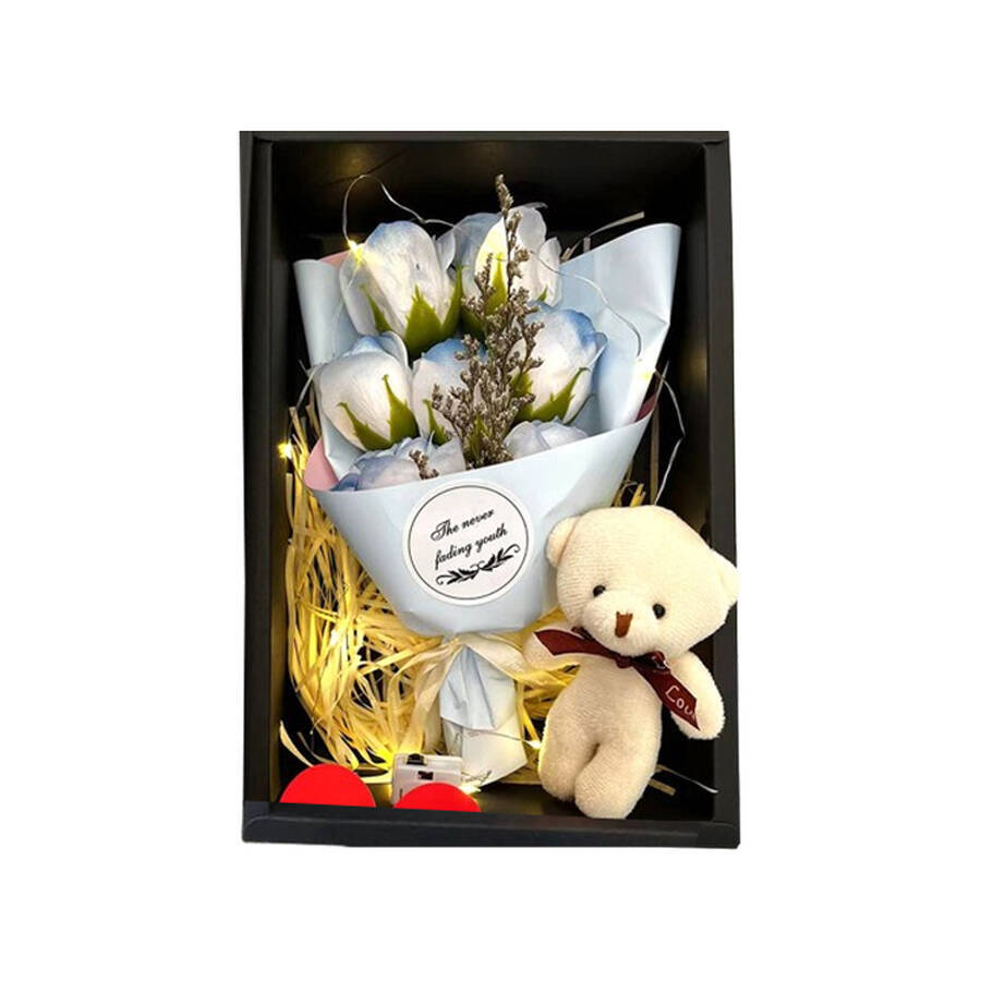 Luxury rose bear gift set featuring an artificial bear and preserved roses.